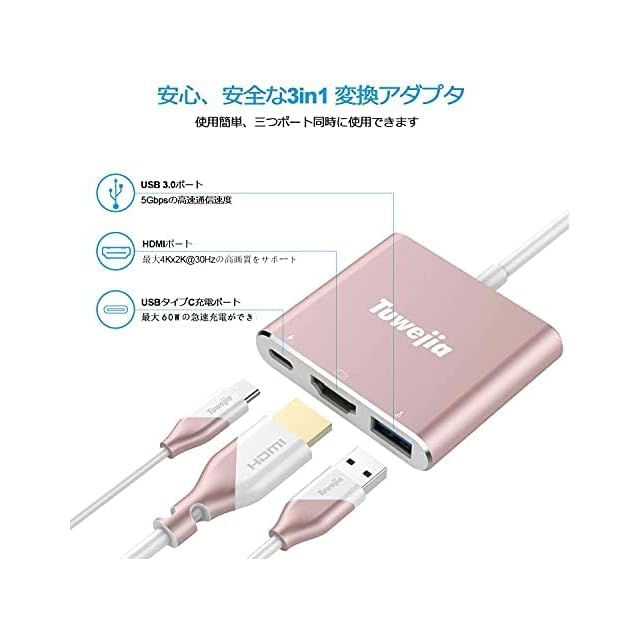 <p>■【HDMIポート】</p> <p> テレビ、モニター / プロジェクタなどと接続して、大画面で高品質の画面を楽むことができます。3840 x 2160ピクセル(4K解像度対応)。</p> <p> </p> <p>■【ノーマルUSBポート】</p> <p> マウスキーボード、マウス、サムドライブ、外付けドライバ、USBフラッシュメモリ等を接続することができます。(速度5GbpsのUSB3.0の高速規格に対応)。</p> <p> </p> <p>■【USB-typeCポート】</p> <p> 主にPCを充電するためのケーブルを接続するためのポートです。充電のみとなっており、USB-Cデータポートを使ってのデータの送受信はできません。</p> <p> </p> <p>■【使用の場合】</p> <p> このアダプタを使用すると、ビデオのストリーミングとオーディオにノートパソコンからHDMI搭載のモニター/プロジェクター/ TVポートを使用して、充電してくださいのタイプCポートに接続されている。より広範囲にを友人、家族で映画を簡単に共有するテレビ、モニター、プロジェクターます。</p> <p> </p> <p>■【安全·安心】</p> <p> 高級感のあるアルミニウム外装を採用します。アルミ素材を採用し、軽量、耐久性、難燃性に優れています。耐振動・耐衝撃性にも優れています、より良い放熱、信号伝送。CE、FCC、RoHS認証取得で安心・安全。</p> <p> </p> <p>■【性能優勢なところ】</p> <p> 先進的なチップを採用します。メインボードと回路の設計を改善することによって、より安定した映像を変換できます。製品寿命を最大限に延ばします。</p> <p> </p> <p>◆製品仕様◆</p> <p> 1、ブランドTuwejia</p> <p> 2、材質:アルミ合金</p> <p> 3、サイズ:5.8*5.3*1.2cm</p> <p> 4、重量:50g</p> <p> 5、カラー:ゴールド</p> <p> 6、USB入力:USB 3.1 Type C</p> <p> </p> <p>◆適用範囲◆</p> <p> ラップトップやパソコン:</p> <p> -MacBook,2018/17/16 /15</p> <p> -MacBook Pro 15"/13",2018/17/16/15</p> <p> -iMac/ iMac Pro, 2017 -2015 Google Chromebook Pixel</p> <p> -New Acer Switch Alpha 12</p> <p> -Dell XPS 12/13/15, Dell Latitude,Dell Precision 5510</p> <p> -Surface Book 2</p> <p> -Nintendo Switch</p> <p> -HP Spectre X2,X360,Elite X2 1012/ Elitebook Folio G1</p> <p> -HP ZBook 15 G3 Mobile Workstation</p> <p> -Acer Spin 7/ Chromebook R13, Acer Aspire V Nitro 15</p> <p> -ZBook 15 G3 Mobile Workstation</p> <p> -Lenovo Yoga 900/910/920</p> <p> -Sumsung Chromebook Plus</p> <p> -HUAWEI MateBook X/ Par</p> <p> -Acer Swift 7 SF713-51-M5MP(NX.GK6CN.002)</p> <p> -Tian Bao Air</p> <p> スマホ( DP Alt Mode搭載):</p> <p> -Samsung Galaxy S8/S8 Plus, S9/S9 Plus,Note 8</p> <p> -Huawei Mate10/ P20</p> <p> -LG G5/LG V20</p> <p> -HTC 10/HTC 11</p> <p> -Lumia 950/950 XL</p> <p> (*上記の意外の機種の対応出来るかどうか保証しておりませんので、ご購入する前にちゃんと対応機種を御確認してください)。</p> <p> </p> <p>☆ご注意:</p> <p> ●弊社の商品は全て3ヶ月間の返金サービスと12ヶ月保証ついておりますので、使用の途中に不具合が生じたら、こちらとご連絡ください。製品の問題がある場合は、まずお気軽にお問い合わせください。24時間以内に返信し、いつでもどこでも問題を解決できるようお手伝