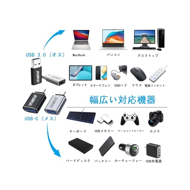 【幅広い互換性】JIURUI USB変換アダプターはWindows10、MacOS、iOS、Android、Linuxなどシステムに適用できます。従来のUSB-AポートからUSB-Cポートへの変換アダプターまたはUSB-CポートからUSB-Aポートへの変換ケーブルを使用することで、幅広いメインデバイスやUSB周辺機器を簡単に接続できます。これにより、ノートPC、タブレット、スマートフォンなどの機器の利用範囲が拡大し、外付けHDD、メモリ、マウス、キーボード、ゲームコントローラー、カードリーダー、プリンター、カメラなど、さまざまなUSB周辺機器を最大限に活用できます。