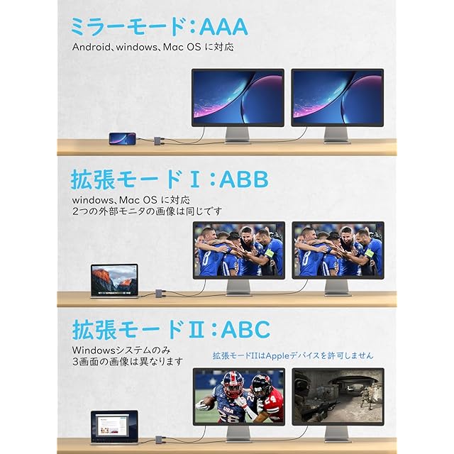 【4K@60Hz HDMI-高解像度】USB Type C to HDMI変換アダプタ-は最大4K@60Hz (3840*2160@60Hz)の解像度、ミラーモードと拡張モードをサポートする。小さいスクリーンの目に対する圧力を解放する。同時に2つのHDMIポートを使用する場合は4K@30Hzだけ出力になる、複数の鮮明なディスプレイでコンテンツをお楽しみいただけます。(ご注意:Apple自身が制限しているので、MacOSデバイスの場合、拡張モードでは、2つの外部モニタの画像は(A+B+C)モードになりません)