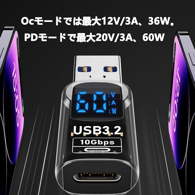 【電力状態可視化ディスプレイ】充電状況をLEDバーと数値で二重表示。従来のアナログ表示と異なり、ワット数表示で電力供給量を視覚的に把握できる設計。充電速度の変化をリアルタイムで確認可能。 【スマート急速充電技術】PD3.0規格準拠のType-Cポートを搭載。20V/3Aの高出力モードに対応し、ノートPCからスマートデバイスまで効率的な充電を実現。過電流防止回路で安定供給を維持。 【次世代データ転送機能】理論上のデータ伝送速度は10Gbpsに規格に準拠した転送速度を採用。大容量ファイルの送受信を効率化する設計で、動画データや高解像度画像の転送作業を短時間で完了可能。 【マルチシーン対応設計】薄型軽量ボディと2個組セット構成。鞄のポケット収納可能なサイズで、移動時の荷物負担を軽減。オフィス・カフェ・車内など多様な環境での使用に適応。 【クロスデバイス接続対応】主要メーカーのノートPC/タブレット/スマートフォンに対応(注:対応機種要確認)。