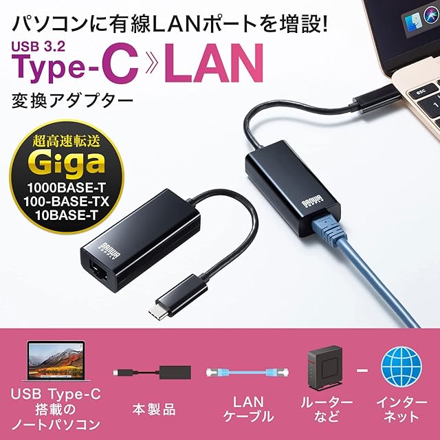 サンワサプライ USB3.2 TypeC-LAN変換アダプタ(ブラック) USB-CVLAN2BKN