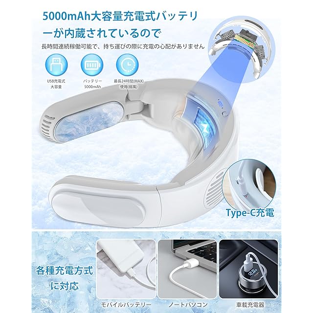 【5000mAhバッテリー&USB充電式】ネッククーラーは5000mAhの大容量バッテリーを搭載しており、弱風ならフルの充電で約10時間の稼働が可能で、長時間の屋外作業や野外イベントでも安心です。付属のUSBケーブルで簡単に充電できるため、多様な充電方式で充電できます。外出時でも快適にお過ごしいただけます。※USBケーブルを接続していても運転中は充電不可です。※電圧入力:DC5V-2A(Max)※製品は内部部品が多いので、取り扱いに注意してください。※使用する前に製品が正常に動作しているかどうかをテストしてください。異常があればすぐに使用を中止し、お問い合わせください。※製品の内部部品が多いので、軽く持ってください。