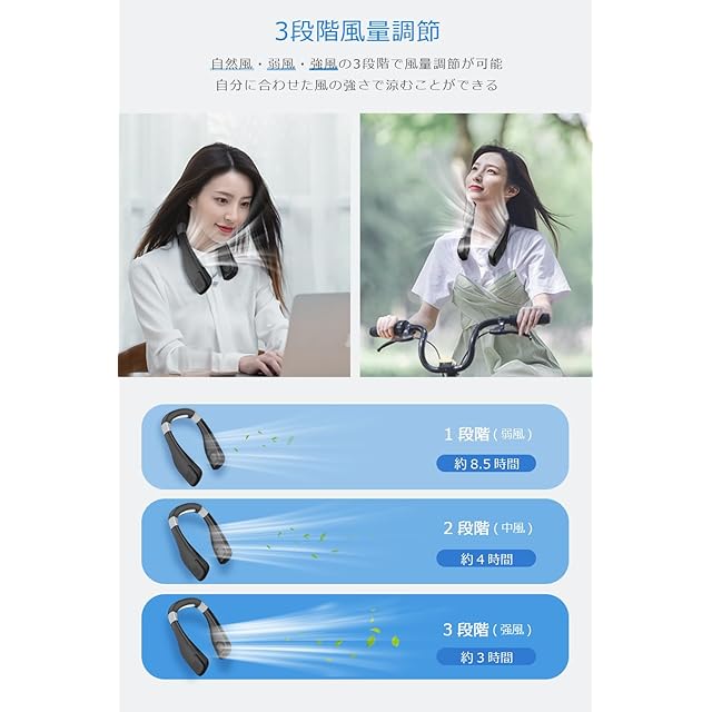 【羽根なし扇風機 三段階風量調節】このネッククーラーは羽根がないため、髪の毛が巻き込まれる心配や怪我のリスクがありません。スイッチの長押しでONとOFFの切り替えができ、スイッチを押すごとに風量を3段階から選べます。炎天下の屋外では「強」、室内では「中」、冷房の効いた部屋では「弱」と、使用シーンに合わせて風量を調節できるので非常に便利です。安全性と使いやすさを兼ね備えた設計が特徴です。