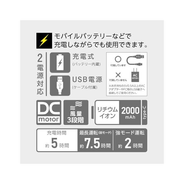 充電時間:約5時間(電池が空状態から充電を開始/室温25℃) 使用時間:強(約2時間)中(約3.5時間)弱(7.5時間)(満充電状態から使用/室温25℃) 使用推奨温度:5℃~35℃ 消費電力:約3.4W USBケーブル長さ:約0.5m