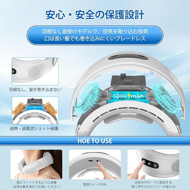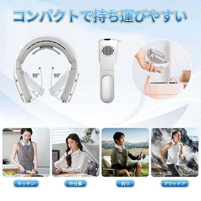 【首かけ式・無羽根・折りたたみ可能】 この扇風機の首かけ式デザインは、その大きな特徴の一つです。人間工学に基づいて設計されており、快適に装着でき、長時間使用しても疲れることはありません。アウトドアスポーツ、ショッピング、オフィスワーク、どんな場面でも、両手を自由にしながら、どこでも涼しさを楽しむことができます。羽根のない設計を採用しており、独自の気流循環技術により、強力で安定した風を届けます。また、髪の毛や他の物が吸引口に巻き込まれるのを防ぐ特許技術が組み込まれており、女性も安心して使用できます。この携帯扇風機はコンパクトで軽量です、折りたたむとバッグやポケットに簡単に収まり、場所を取りません。どこにでも持って行って、いつでも涼しさを楽しむことができます。