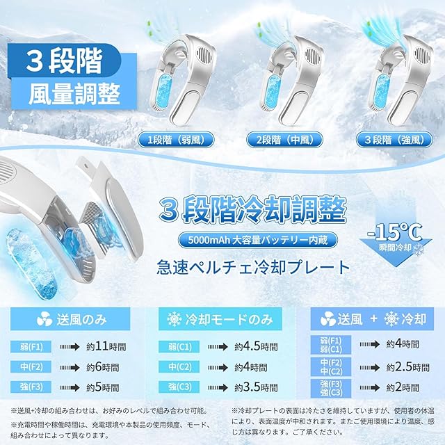 【2つのモード・3段階調節可能】 この首かけ扇風機は、送風と冷却の2つの機能を備えており、それぞれの機能に3つの異なる段階の調節が可能です。お好みや環境に応じて適切な段階に調節し、快適な涼しさを楽しむことができます。扇風機はそれぞれ独立したボタンで操作でき、操作が簡単で、高齢者でも簡単に使用できます。
