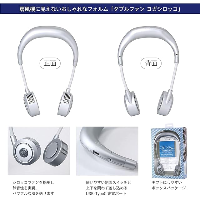 両手が使える ハンズフリー 首掛け扇風機 WFan ダブルファン ヨガシロッコ メタリックシルバー SPICE OF LIFE(スパイス) 静音 5段風量 650分連続使用 首かけ フィット感 ニッケル マスクファン 熱中症対策 リズム風 USB 500回充電 DFYS213MSV