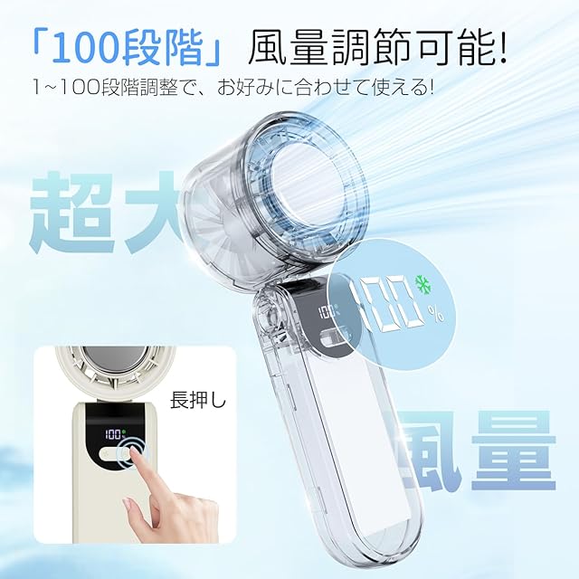 【1-100無段階調節】100段階の風量調節で、そよ風からパワフルな強風まで細かく調整可能!長押しすることで1~100まで早送り・早戻しに調整でき、就寝時は弱風、暑い日は強風、様々なシーンに合わせて使える冷却プレートつき扇風機。LED表示で風量とバッテリー残量を交互に出て、一目瞭然!7枚の羽根を採用し、均一でパワフルな風を生み出す。