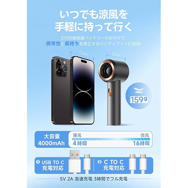 【バランスの良さ】1からの独自設計に、21700高性能バッテリーを採用することで、携帯性と長持ちを両立するハンディファンに完成! わずか159gの軽量さ、スマホ以下のコンパクトさなのに、丸一日使える最大16時間運転を実現。首元や体を短い時間で冷やす爆風モードでも4時間使用可能、従来品より涼しい時間が2倍以上長く!