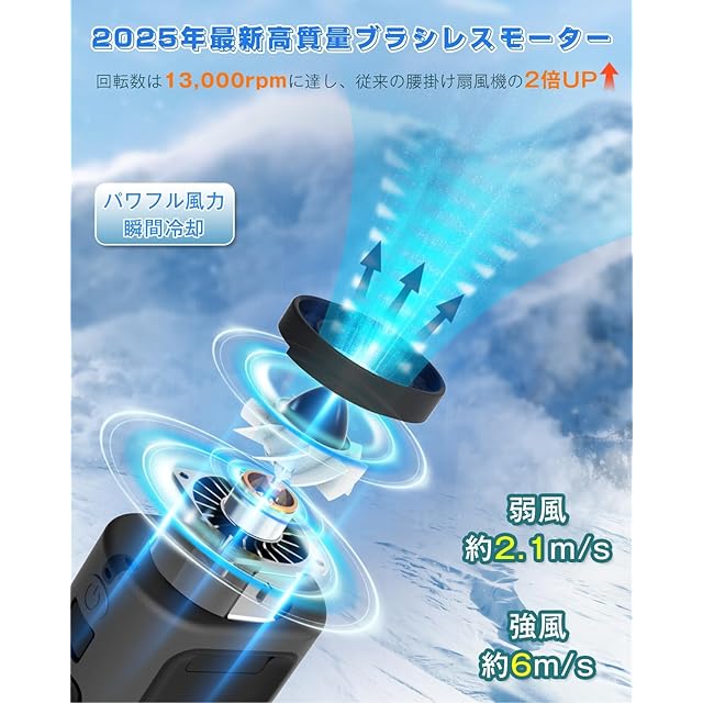「フルアップグレードベルトファン」このベルトファンは2025年最新高質量ブラシレスモーター技術を採用し、回転数は13,000rpmに達し、従来の腰掛け扇風機の2倍です。さらに、底部の吸気口風道構造、9枚の螺旋桨式羽根、流線型ロケットヘッドデザインの組み合わせにより、気流抵抗を大幅に減らし、風をより集中して強力に吹き出します。風速は最大6m/秒に達します。スイッチを押すと、強力で涼しい風が直接身体と服の間に流れて、効率よく体の熱を取り除き、涼しく快適な環境を実現します。