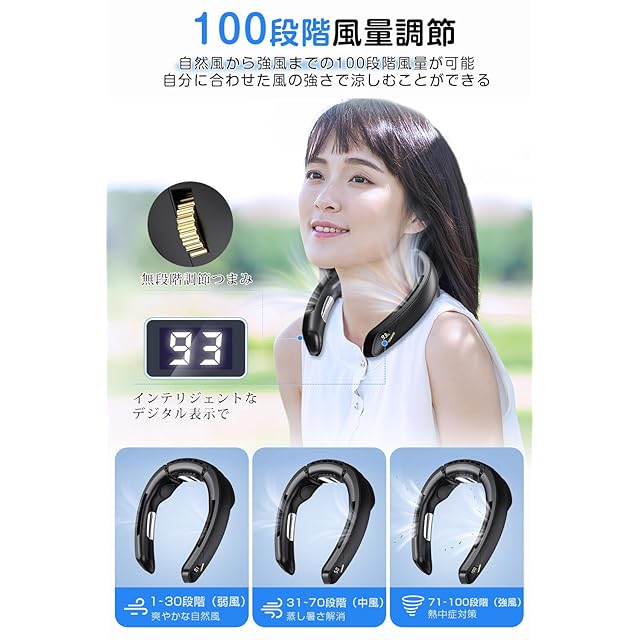 【強力送風&100段階風量調節 涼しさを楽しめる】このネックファンは、デュアルチャンネルターボブレードを利用し、業界トップレベルの7500r/m高速回転のダブル稼働モーターを搭載し、強力な集風を実現して集風効果を99%向上させます。送風は従来製品より風量が多くて本物の大風量!ネックファン右側のつまみを回すことで、風量を1~100段階まで調節できます。送風時、電源ボタンを短く押すと、冷却プレートが作動します。操作は簡単で、お年寄りやお子様も利用できます!