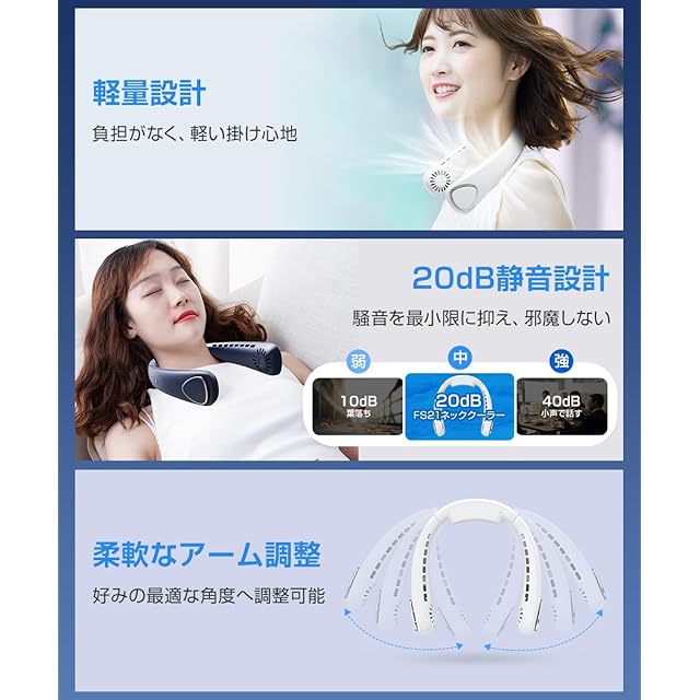 【3段階風量調節&柔軟なアーム】風量は弱・中・強の3段階調節に対応。暑さや使用シーンに合わせて自由に切り替えられます。首回りに合わせて柔軟に曲がるアームは、どんな体型の方でも快適フィット。フィット感と安定感に優れ、長時間装着しても疲れにくい 首掛け扇風機 です。