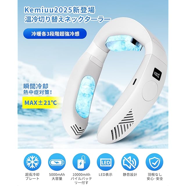 Kemiuu ネッククーラー 首掛け扇風機 冷却プレート ペルチェ【2025新デザイン 瞬間冷却・冷暖両用】静音 軽量 冷感 羽根なし 冷暖各3段階温度調節 内蔵5000mAh 付属10000mAhモバイルバッテリーが 大容量 電池残量デジタル表示 長時間連続使用 usb 充電式 首掛けエアコン 熱中症対策 暑さ対策 (オフホワイト)