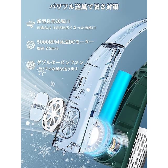 【折りたたみ式&角度調節機能】このネッククーラーは人間工学に基づいたデザインに改良を加え、3Dネックライン曲線デザインで完璧なフィット感と、わずか308gの超軽量で首に負担のない装着感を実現しました。くびかけ扇風機に角度調節と折りたたみ構造を実現して、扇風機 首掛けのアームは135度調節可能です。送風角度を調節できて、自分好みの風向きで涼むことができます。首 扇風機のネックバンドは通気性と防汗性に優れた手触りの良いシリコン素材を選択して、汗に優しく、女性から男性まで、あらゆる体型の人の首に合わせたサイズの調整も可能です。【コンパクトなサイズ】新開発の折りたたみ式で鞄に入れて気軽に持ち運び可能、いつでもどこでも、首からかけるネック クーラーとしてお使いいただけます、両手が自由になることで快適に使用できます。気持ちよい自然の風をどこへでも持ち運べます。