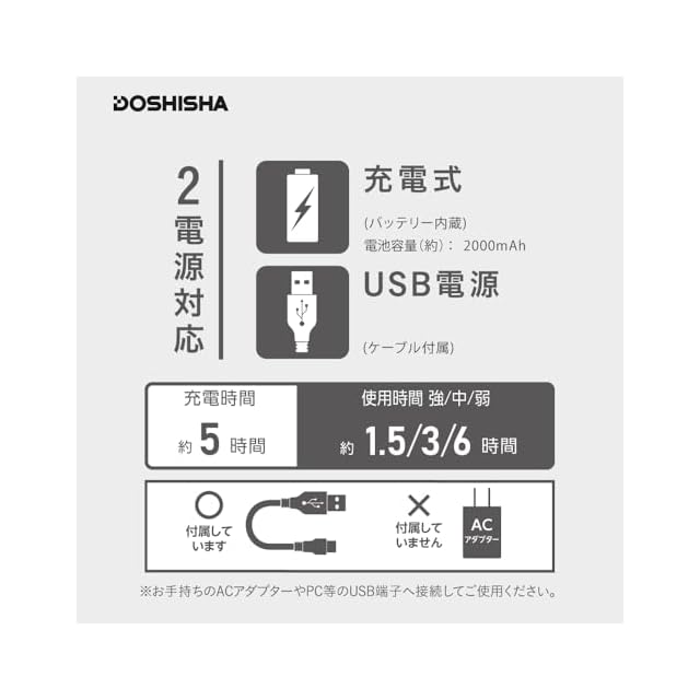 充電時間:約5時間(電池が空状態から充電を開始/室温25℃) 使用時間:強(約1.5時間)中(約3時間)弱(6時間)(満充電状態から使用/室温25℃) 使用推奨温度:5℃~35℃ 消費電力:約3.4W USBケーブル長さ:約0.7m