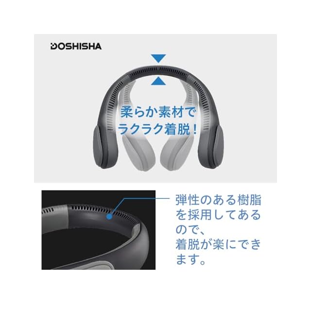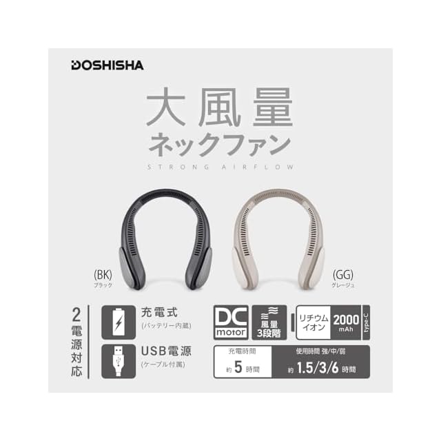 ドウシシャ 大風量 ネックファン 2電源対応(充電式・USBケーブル) 充電時間5時間 風量3段階 DC ブラック