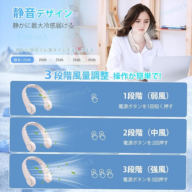 【2025最新業界先端モデル・羽根なしネッククーラー&急速冷却】Freeluckの最新バージョンの折りたたみ式ネッククーラーは、空気流とノイズ低減機能をアップグレードしています。この首掛け扇風機は、より強力な気流と低騒音を備えており、常に冷却を維持しています。独立風カバー技術と二重タービン扇葉設計を採用し、寿命が長く、風速を高めた。従来の首掛けファンよりも安全で、髪が挟まれたりほこりが出たり、汗が首掛け扇風機に入ったりする心配がありません。暑い夏に仕事仲間としての理想的な選択。2024年夏改善点:首の中央に柔軟なシリコンを採用しています。一人一人の骨格に合 わせてフィットする。首の中央に柔軟なシリコンを採用しています。一人一人の骨格に合 わせてフィットする。首掛け部分に広がりやすいようにシリコン素材を使用し ているため、脱着しやすくなっています。