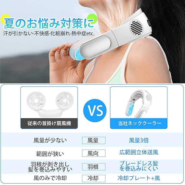 首元を効率的に冷却する冷却プレートと、3段階調節可能なネックファンを一体化した革新的な首掛け扇風機です。従来の首掛け扇風機と異なり、半導体技術で冷たい風を直接肌に届けることで、猛暑日でも体感温度を最大38℃から30℃にダウン。さらに、広範囲立体送風で汗のベタつきや化粧崩れを防ぎます。