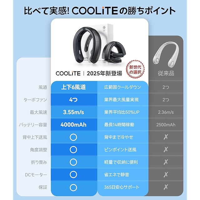 【長持ち!14時間のクールダウン!】COOLiTE首掛けファンは高密度積層バッテリー(PSE/METI認証取得済)が内蔵され、4000mAhの大容量で最大14時間持続!2つの使用モードと3段階の風量を調節可能、お好みやシーンに応じて自由に切り替えてより快適にご使用!ランニングやお散歩、スポーツやアウトドアはもちろん、通勤やショッピングなど普段使いも大活躍!炎天下の屋外作業者、通勤で汗に悩むサラリーマン、猛夏に弱い高齢者と子供、あらゆる世代が「これがあって良かった」と実感するでしょう~