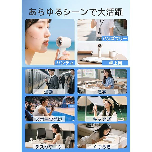 【こんなときに大活躍】手持ち/卓上用/首掛けの3WAYハンディファン。通勤・通学ではハンディファンとして。会社や学校ではデスクファンに早変わり。外で思いきり遊ぶときもストラップを使って身軽に。※ストラップは別途購入必要。 オリジナルでシンプルなフォルム、高級感あふれるカラーリングと素材感、暑い季節の爽やかな贈り物としても。