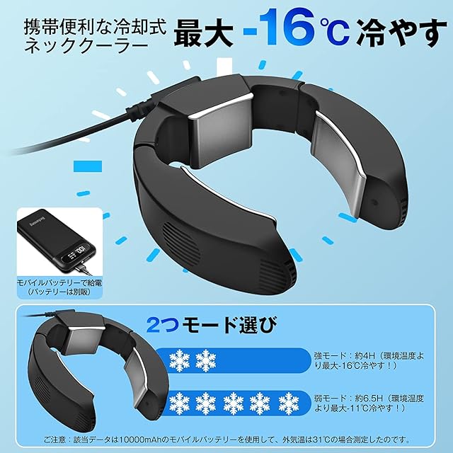 【三つの部分冷製・超時間連続駆動】従来の二つの冷却プレートより、更に進化した三つの部分冷製が搭載しております。左右側冷却だけでなく、首もと冷却ブレードがつきます。本物の首掛けエアコンです。強モード:両側と首もとは外気温より最大-16℃冷却 、稼働時間約4H。 弱モード: 両側と首もとは外気温より最大-11℃冷却 、稼働時間約6.5H。(稼働時間は10000mAhのモバイルバッテリーを利用する場合測定したものです。) 外出にもお気軽いに使用いただけます。(ご注意:該当商品はバッテリー内蔵なし、別途用意する必要があります。)