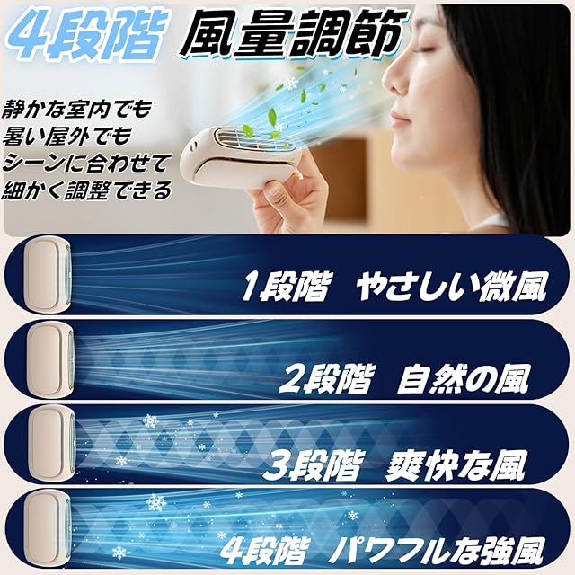 【1台4役多機能扇風機】「首掛け扇風機」ネックストラップ付き、上部送風で首にかければマスクつけていても、顔がさっぱり!「腰掛け扇風機」:本体の裏側にクリップ付き、ベルトに付けるだけ、服内に循環送風!「卓上扇風機」:本体のスタンドを付ければオフィスなどデスクの上でもひんやり。「手持ち扇風機」:いつでもどこでも爽やかに!携帯扇風機は手持ち・卓上・折り畳み・首掛け扇風機との4タイプ機能を同時に備え、4in1なモデルが来年の夏でもあなたの好み味方.