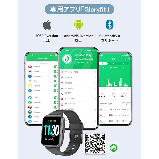 【100+種類運動モード・IP68防水防尘】このスマートウォッチには、ウォーキング、ランニング、サイクリング、スキー、サッカー、バスケットボール、野球、ヨガなど、100種類以上のスポーツモードが搭載されています。GloryFit APPで運動履歴を見ることができ、正しい記録は運動計画の作成や運動時間の管理に役立ちます。IP68レベルの防水及び防塵性能を持っており、日常生活の中で手洗い、顔洗い、水濡れを気にすることなく、雨の日やプールても着用可能となります。※お風呂、サウナ、温泉水や温泉の湯気及び高い水圧は故障の原因となります。