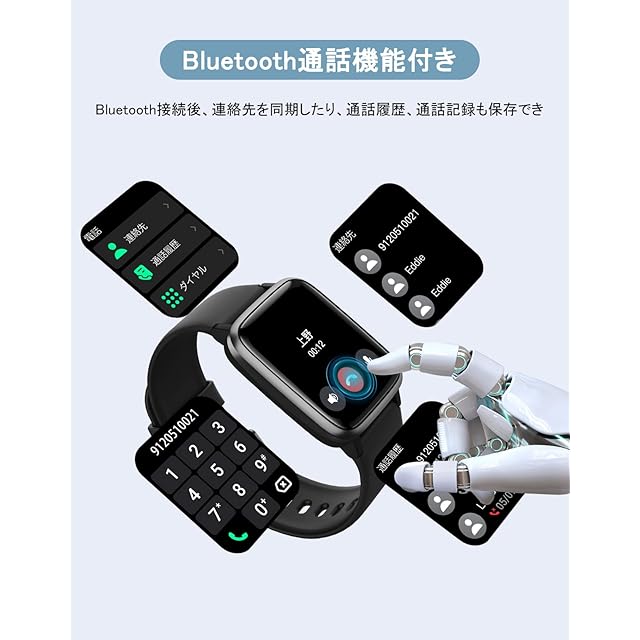 【HD大画面・DIY文字盤】1.83インチの大画面、240×284の高解像度で鮮明な画質が楽しめます。 通知や文字が一目瞭然!フルスクリーンタッチにより、上下左右のスライド操作と画面切り替えをスムーズにスワイプして使用感がよくなります。また、画面の点灯時間や画面の明るさは時計で調整できます。このスマートウォッチには5つの文字盤が内蔵されています。また、GloryFit APPには200種類以上の文字盤が搭載されています、自由に選ぶことができます。スマホのアルバムからお気に入りの写真を選んで文字盤に設定することもできます。 気分に合わせて毎日文字盤をカスタマイズできます。 【Bluetooth通話・メッセージ通知・音声アシスタント】Bluetooth 5.2を搭載し、接続の安定性が大幅に向上し、データ転送が高速化されます。スピーカーとマイクを内蔵し、スマホとの接続後は、ウォッチで電話を受けたり、掛けたりすることができます。スマホの電話帳と同期し、通話記録も保存できます。また、LINE、SMS、Twitter、Facebook、Instagram、Gmailなどのアプリからの通知を受け取ることができます。 通知を受信すると時計が振動し、メッセージを見逃しません。パスコードロックも付いているので、誰かにメッセージを見られる心配もありません。 また、音声アシスタントは、スマートウォッチ上でタップすると起動します。Ganriverは、生活や仕事の効率を向上させます。 【100+種類運動モード・IP68防水防尘】このスマートウォッチには、ウォーキング、ランニング、サイクリング、スキー、サッカー、バスケットボール、野球、ヨガなど、100種類以上のスポーツモードが搭載されています。GloryFit APPで運動履歴を見ることができ、正しい記録は運動計画の作成や運動時間の管理に役立ちます。IP68レベルの防水及び防塵性能を持っており、日常生活の中で手洗い、顔洗い、水濡れを気にすることなく、雨の日やプールても着用可能となります。※お風呂、サウナ、温泉水や温泉の湯気及び高い水圧は故障の原因となります。 【多機能応用・適応機種】毎日の歩数、歩行距離を時計で確認できます。 毎日の運動目標を設定することで、運動をする習慣をつけることができます。また、呼吸、座りすぎ通知などの機能も搭載しています。 生理周期機能も備えています。更に、スマホ探し、電卓、音楽制御/再生、アラーム、SOS緊急通話、タイマー、ストップウォッチ、おやすみモード、カメラリモート、天気予報、懐中電灯、振動強度調整、腕上げ点灯、画面の明るさ調整、ゲームなどの機能があり、生活を便利にしてくれます。IOS 9.0 / Android5.0以上対応のスマートフォンに対応しています。 【多種言語設定・大容量電池】スマートウォッチを日本語、英語、韓国語などに設定することができます。 初回ご使用時に日本語取扱説明書をご用意しております。300mAhの大容量バッテリーを内蔵し、2.5時間でフル充電できます。フル充電で一度に5~7日間使用でき、待機時間は最大30日間可能です。(バッテリー持続時間は使用頻度により異なります。)