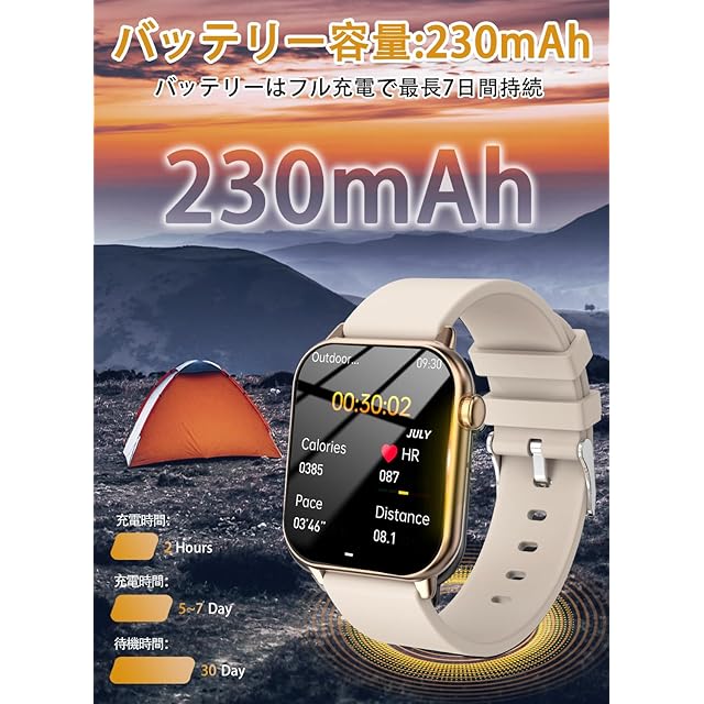 【大容量バッテリー&Diy文字盤】本スマートウォッチは230mahの大容量バッテリーを内蔵し、頻繁に充電する必要がなく、旅行や出張先でのバッテリー切れの心配も不要です。付属の磁気充電ケーブルをスマートウォッチの充電端子に接続すると充電開始となります。 アプリには200種類以上の幅広いテーマのウォッチフェイスが用意されています。お気に入りの写真にしたり、ウィジェット編集が可能なフェイスを活用して、5種類のメニュースタイルと合わせて、個性的な文字盤をゲットできます。