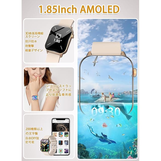 スマートウォッチ AMOLED画面【2025性能最強モデル】通話機能 1.85インチHD Bluetooth5.3 SMS/Line/メッセージ通知 軽量 iPhone&アンドロイド対応 音楽再生 天気予報 多機能 様々な種類運動モード GPS機能 IP67生活防水 スポーツウォッチ レディース メンズ DIY文字盤 (ゴールド)