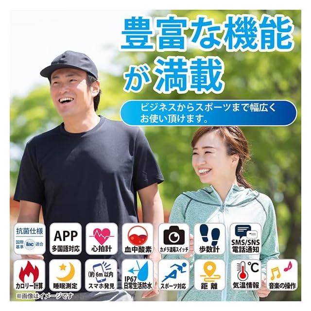 【機能一覧】歩数計、心拍計、カメラ遠隔スイッチ、歩数計、SMS/SNS通知、電話通知、カロリー計算、睡眠測定、スマホ発見(6M以内)、IP67日常生活防水、運動モード対応、温度計、音楽再生