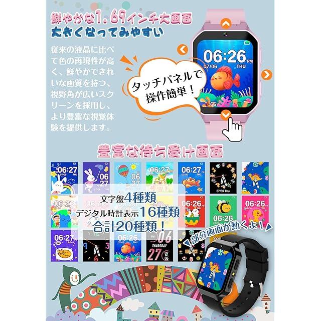 【1.69インチ見やすい大画面&シンプルなデザイン&多彩な文字盤】2024年に新しくアップグレードされたキッズ用のスマートウォッチです。大きくて明るい1.69インチのカラースクリーンを搭載され、320*240ピクセル高解像度で、クリアで鮮やかなビジュアルを実現しました。大人っぽくてクールなデザインや可愛くてポップなデザインなど様々な文字盤が複数用意されており、好みや気分によって文字盤を変更することできます。動く待ち受け画面もあります。さらに、この子供腕時計で撮った写真を待ち受けを設定することも自由自在!定番の黒のほか、ピンクやパープル、ブルー合計4色ご用意しております。お好きな色をお選びいただけます。