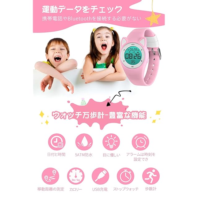 スマートウォッチ 腕時計 猫 女の子 ピンク ウォッチ万歩計 キッズ 活動量計 充電式 子供 デジタル腕時計 防水 スポーツウォッチ 万歩計 腕時計型 フィットネスウォッチ 振動式アラーム/日付/曜日/ストップウォッチ/長持ちバッテリー ガールズ 誕生日 入学祝い プレゼント