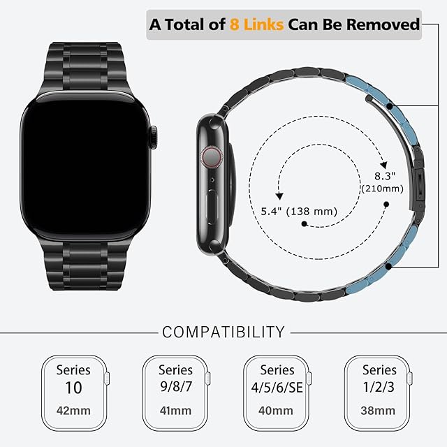 簡単な調整: Hitzee アップルウォッチ ステンレススチール メンズ/レディース ブレスレットには、取り外し可能なリンクが 8 つ付いており、各側に 4 つ付いています。 同梱されているリンク削除ツールは、簡単にサイズ調整できます。バンドは 5.4"-8.3"(138mm-210mm)の手首に適合し、 38mm / 40mm / 41mm / 42mm の Apple Watch モデルと互換性があります