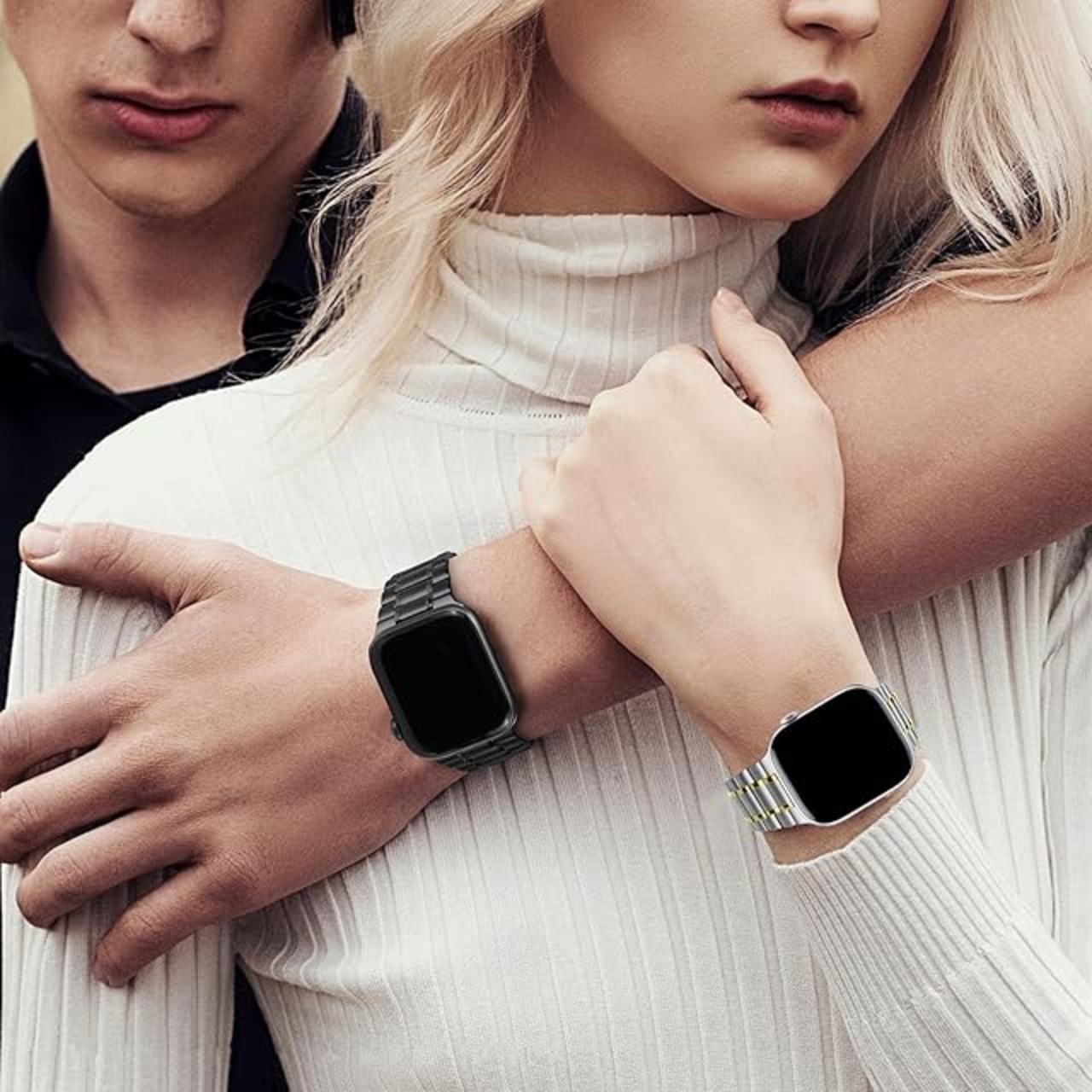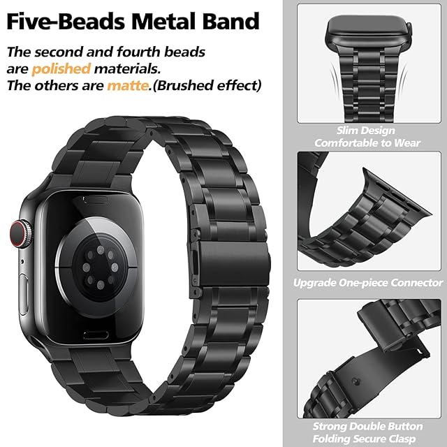 ファッションとエレガントなデザイン: このメタル Apple Watch バンドは、中央に 2 つの光沢のあるリンクを備えた 5 リンク デザインが特徴で、手首に輝きを加えます。両側に折りたたみ留め金のダブルボタン保険で設計されており、取り外しと取り付けが簡単です。バンドは 22mm で、折りたたみ式留め金に向かって 18mm まで細くなっており、軽量で洗練されたデザインで、男性にも女性にも似合うようになっています