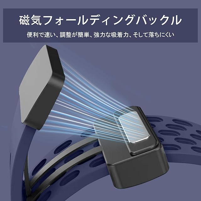 【素材】時計バンドの素材は、肌に刺激を与えない高品質の環境に優しいシリコン製です。肌に優しく柔軟性に富んでいます。撥水処理が施されており、汗や水に強く、清潔な状態を保ちます。また、取り付けが簡単で、マグネット付きバックルにより簡単に装着・着脱ができます。快適な着用感、引張試験、長寿命、頑丈さと耐久性。バンドは通気性に優れた設計です。シリコン素材は通気性に優れ、スバンドを通して空気が自由に循環します。これにより、激しい運動中でも手首を涼しくドライに保ちます。