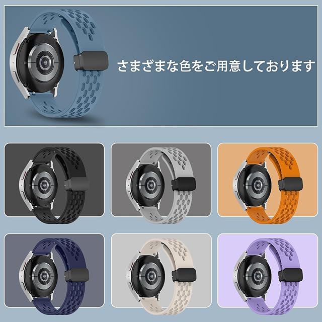 【素材】時計バンドの素材は、肌に刺激を与えない高品質の環境に優しいシリコン製です。肌に優しく柔軟性に富んでいます。撥水処理が施されており、汗や水に強く、清潔な状態を保ちます。また、取り付けが簡単で、マグネット付きバックルにより簡単に装着・着脱ができます。快適な着用感、引張試験、長寿命、頑丈さと耐久性。バンドは通気性に優れた設計です。シリコン素材は通気性に優れ、スバンドを通して空気が自由に循環します。これにより、激しい運動中でも手首を涼しくドライに保ちます。