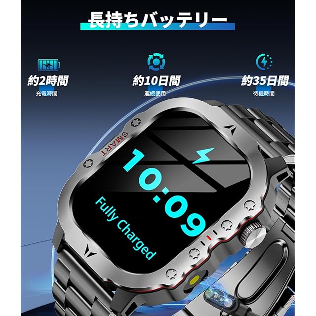 【2025業界最先端技術・軍用規格・懐中電灯付き】スマートウォッチは2.0インチ高精細超大画面を採用しており、文字は従来のスマートウォッチよりも大きく、視力の悪い人には非常に優しい。AIチップが内蔵されており、スマホと同様に鳴動・振動モード、または振動のみモードまたは消音モードを設定することができます。高透過率、耐衝撃、キズ防止があるHDタッチサファイアガラスと高強度と高硬度のあるステンレス製フレームの組み合わせにより、上品ながらも頑丈な設計を実現している スマートウォッチ 軍用規格 です。さらに、本スマートウォッチ 丸型の側面にLED照明灯が付いています。通常の懐中電灯よりも携帯性に優れて、夜間に光を提供し、アウトドア探検には最適です。
