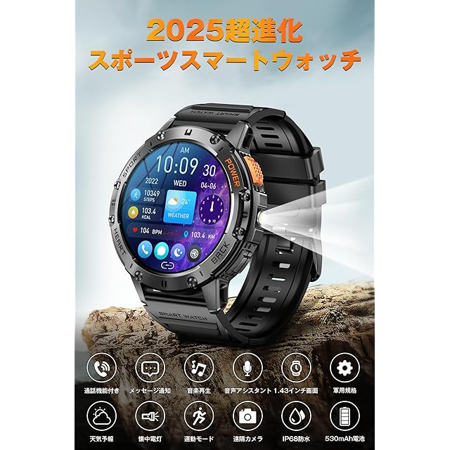スマートウォッチ 【2025革新モデル 軍用規格&防水防塵耐衝撃】1.43インチAMOLED高精度画面 懐中電灯付き 通話機能付き 530mAh長持ちバッテリー iphone対応 アンドロイド対応 メッセージ通知 音楽再生 音声アシスタント 腕時計 100+種類運動モード Smart watch スポーツウォッチ 文字盤自由設定 天気予報 メンズ レディース