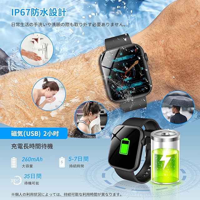 【 IP67防水&耐久バッテリー】IP67級の防水及び防塵性能を持っており、汗、雨、水しぶきに対応しています。日常生活の手洗いや洗顔の際も取り外す必要がありません。※お風呂、サウナ、温泉水や温泉の湯気及び高い水圧等の高温環境では着用しないでください。このスマートウォッチは260mAh大容量バッテリーを搭載され、 2時間の充電で、約5-7日間の使用時間と36日間の待機時間を提供し。頻繁に充電する手間が省けます。付属の磁気充電ケーブルをスマートウォッチの充電端子に接続すると充電開始となります。(個人の利用状況によっては、持続可能な利用時間が異なります) 。