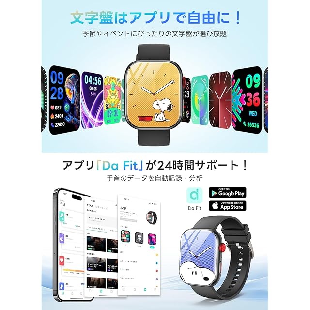 ✅【2.01インチHD大画面&自由な文字盤カスタマイズ】2.01インチの超大画面ディスプレイを搭載し、より鮮明でスムーズな視覚体験を提供します。専用アプリ「DAFIT」を通じて100種類以上の文字盤をダウンロードできるほか、お気に入りの写真でDIY文字盤を作成し、毎日異なるスタイルを楽しめます。バンドも交換可能で、自分だけのスマートウォッチにカスタマイズできます。