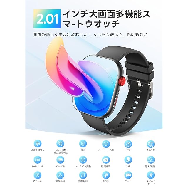 【Amazon.co.jp限定】スマートウォッチ【2025年新登場】2.01インチ大画面 Bluetooth通話機能付き IP67防水 長持ちバッテリー 多機能スポーツウォッチ iPhone/Android対応 LINE/SMS通知 音楽制御 DIY文字盤 日本語説明書(ブラック)