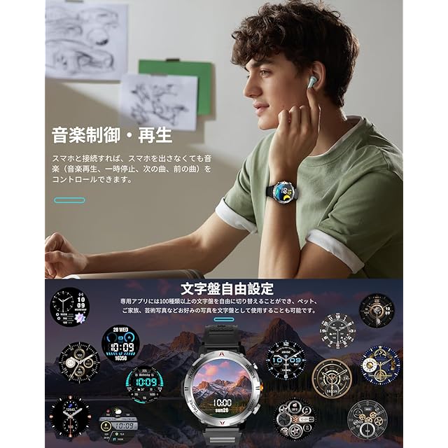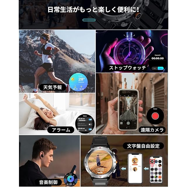 【防塵防水&軍用規格スマートウォッチ】スマートウォッチは1.46インチの丸型カラースクリーンを搭載され、326ppiの高解像度より大きく高精度な大画面で文字を表示されます。スマートウォッチ本体は特殊な複合材料亜鉛合金+ABS素材の耐衝撃材料を採用され、MIL軍事規格に準拠しており、優れた耐低温、耐高温、耐衝撃、防水防塵などを備えています。アウトドアや、粉塵の舞う製造工場で使用することができ、水や汗による故障の心配なく利用できます。日常使いはもちろん、アウトドアにも最適!