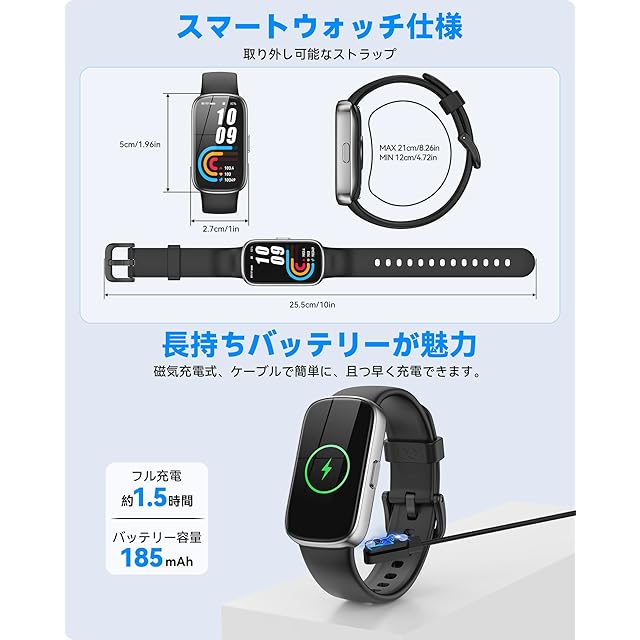 【大容量バッテリー&幅広い互換性】スタンドバイ時間は最大で20日ほど、160mAh大容量バッテリーを採用しており、日常使用の場面でも5-7日に持続使用することが可能です。頻繁な充電を心配する必要はありません。フル充電はわずか1.5 ~ 2時間かかり、バッテリー残量を心配することなくスマートウォッチを楽しむ時間が増えます。このスマートウォッチは ios 9.0以上/android 4.4以上のスマートフォンに対応しています。互換性に迷惑しておる方々はお気楽にお問い合わせくださいませ。