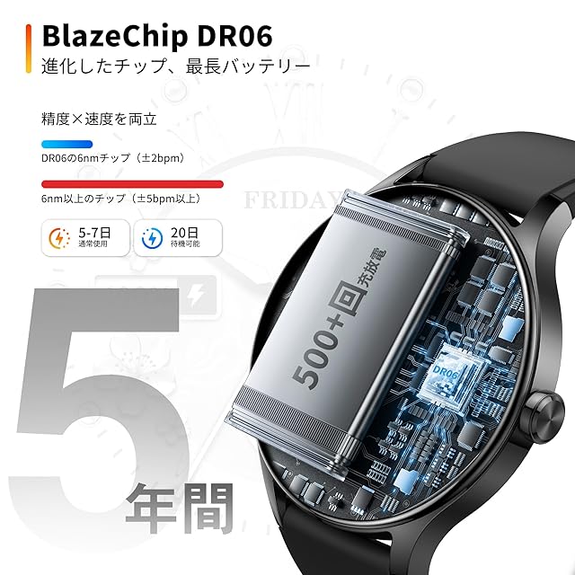 【トップクラスの高精度センシングチップ&20日間連続使用】 6nmの次世代チップを搭載し、測定誤差±2bpm以下を実現。24時間連続モニタリング時でもデータのブレが少なく、トレーニング効果の分析や健康管理に信頼性の高い情報を提供します。290mAh大容量バッテリーで最大20日間の連続使用が可能(※通知頻度により変動)。30分の急速充電で3日間駆動します。