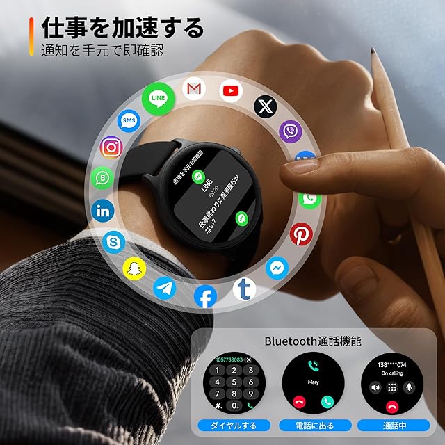 【Bluetooth通話&メッセージ通知の利便性】 LINE/Facebook/Gmailなど主要アプリの通知をリアルタイム表示(※返信機能なし)。着信時に内蔵スピーカーでベル音再生+振動通知のダブルアラートを実現。Bluetooth5.3でスマホと安定接続し、腕時計から直接通話が可能。運転中や作業中でもスマホを取り出す手間が省けます。