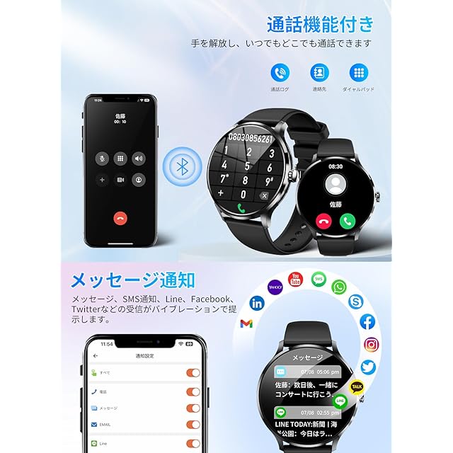 【最先端のBluetooth5.3搭載·通話/メッセージ通知 & 通話機能付き&Lineメッセージ通知&便利な機能満載】★smart watchはスピーカー&高性能マイクが内蔵され、携帯電話を出さなくても、通話することができます。専用アプリと接続するとスマートウォッチで直接に電話をかけたり、終了したりすることができます。応答、拒否、ミュートなど操作は可能。運転中でも運動中でも両手を解放できます。★また通話履歴を表示され、通話記録を保存することもできる。そしてLine、Facebook、Twitter、などの通知もお知らせしますので重要な情報を見逃すことはません。★smart watchとスマホがペアリングし、電話、Line、SMS、Twitter、Facebook、insgramなどのソフト情報は気軽に手元で確認できます。一切の大事な連絡を絶対に見逃しません。