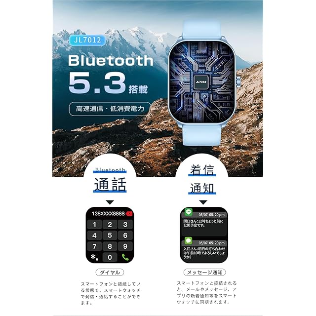 ⌚【Bluetooth 5.3通話】Bluetooth5.3通話機能があるスマートウォッチです。スマートウォッチにマイクとスピーカーが搭載、スマホと接続してから、直接通話でき、とても便利です。更に、内蔵スピーカーでスマホなしでも音楽を楽しめます。