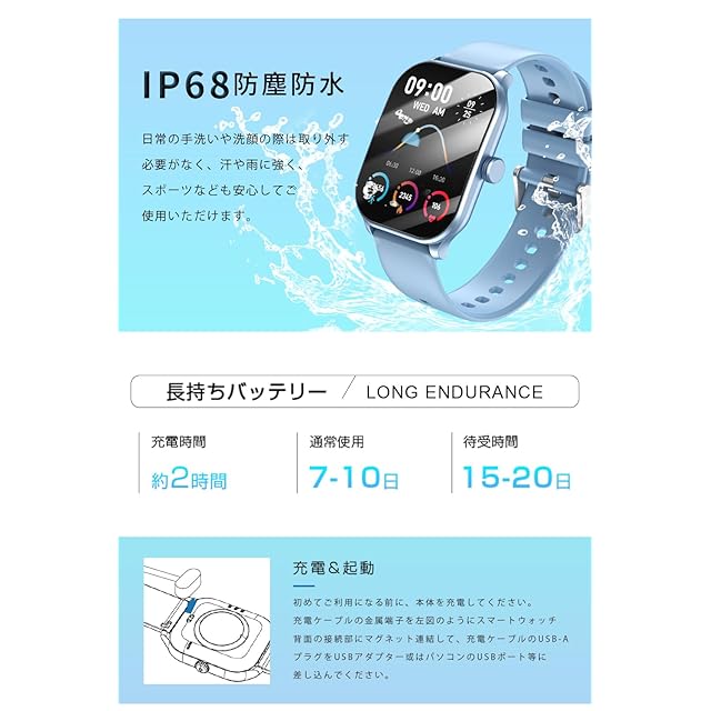 ⌚【IP68防水防塵】IP68防水レベル。防水仕様で、日常的の手洗い、洗顔、雨、汗などに恐れず、スイミングでも利用できます。