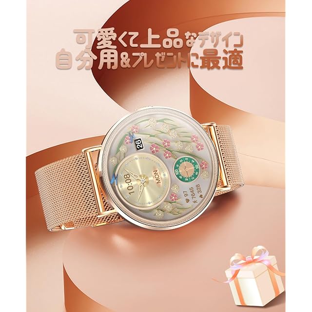 【エレガントな小ささ・洗練された超薄型デザイン】Muckol 丸型スマートウォッチは、女性の手首にぴったりな1.32インチのAMOLEDディスプレイを搭載しています。文字盤の2時位置には小窓があり、日付を確認することができます。超薄型のデザイン(厚み6.9 mm!)はエレガントかつシンプルで、日常生活や仕事場でも実用性と美しさを兼ね備えたスマートウォッチです。